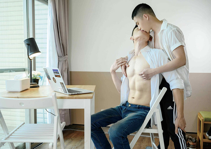 从背后偷袭而来的LOUIS抚摸着KERRY身体的每一处,让正在忙着工作KERRY也开始招架不住。